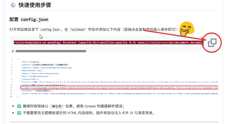 '单引号'包裹,避免 Gmeek 构建器解析错误;这里我使用的是转义方法。 - ✅ 不需要更改主题模板或任何 HTML 内容结构,插件将自动注入卡片 UI 与渐变背景。